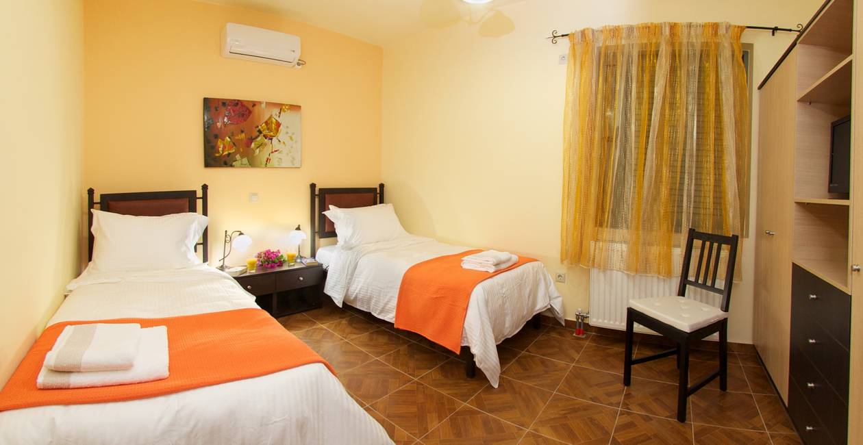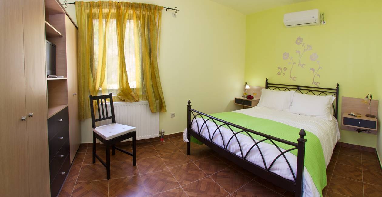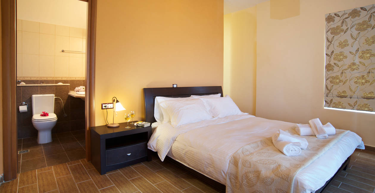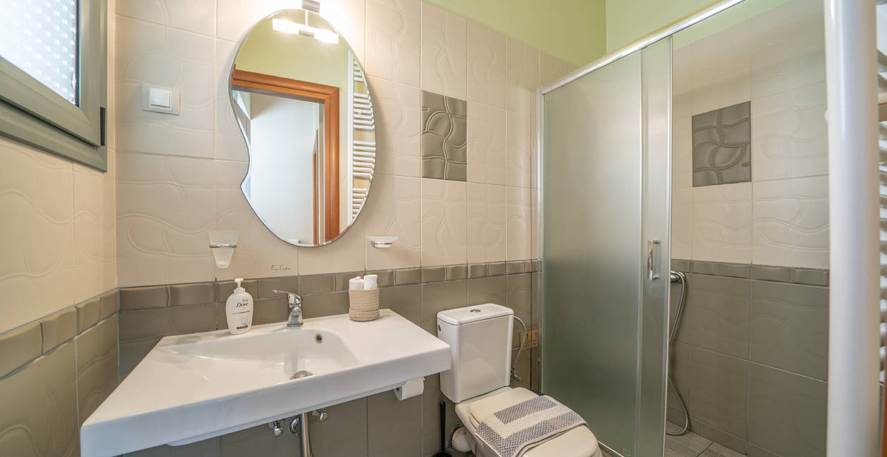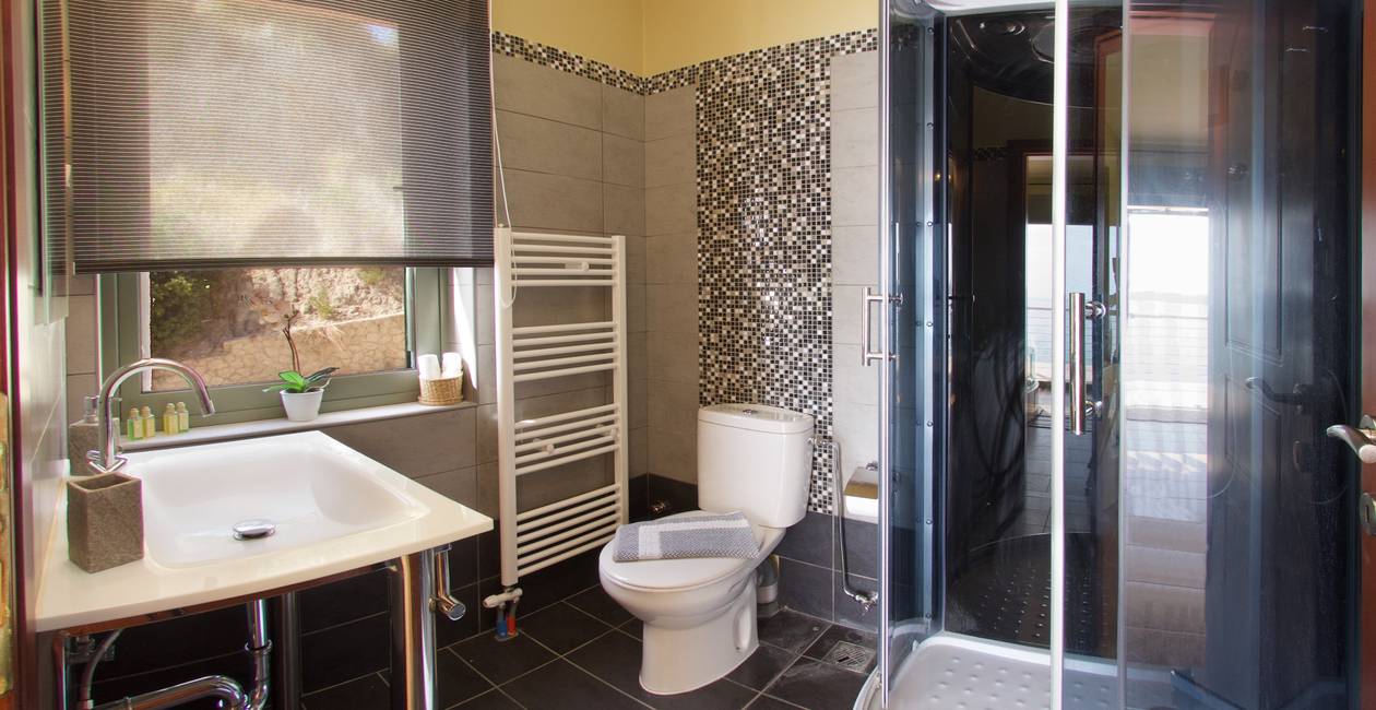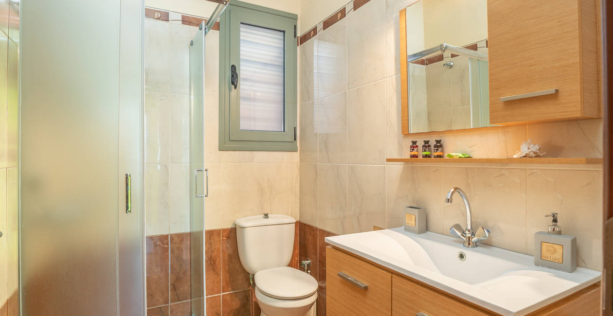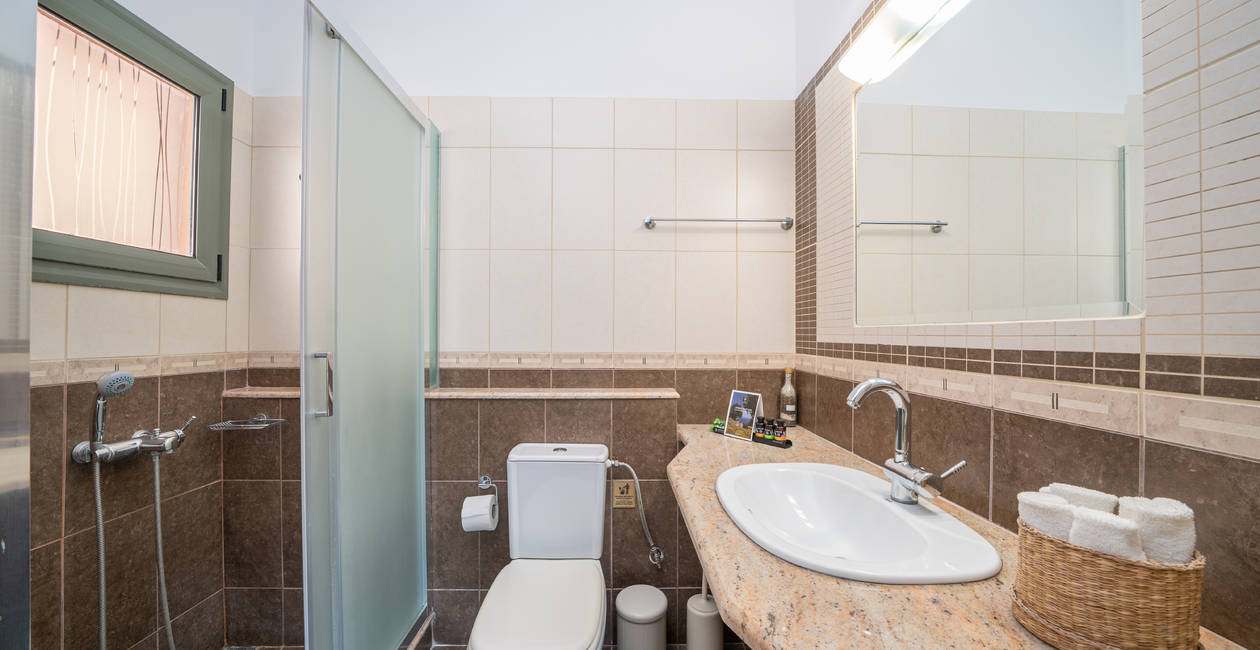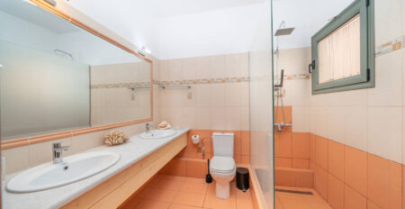 The villa’s interior arrangement is upside down! The living room, the kitchen and one of the double bedrooms with a separate bathroom are on the upper level, while the rest of the sleeping quarters are on the lower level – a traditional Greek arrangement. All bedrooms are air-conditioned and have ample storage for clothes and personal belongings. All the bedrooms on the lower level open straight onto the pool area.