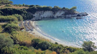 A combination of a small sandy cove and the rocky platforms that end in the crystal blue waters will leave you speechless. Ainos mountain's view while swimming and wandering around the cliffs are beach's musts.