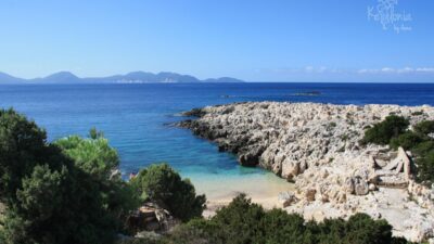 A combination of a small sandy cove and the rocky platforms that end in the crystal blue waters will leave you speechless. Ainos mountain's view while swimming and wandering around the cliffs are beach's musts.
