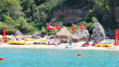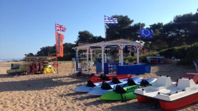 Extreme Watersports is located on Antisamos Beach for activities such as jet ski, wakeboard/kneeboard, water ski, crazy sofa, tubes and sliders, banana, rides, pedal boats, sub-wing, and more!