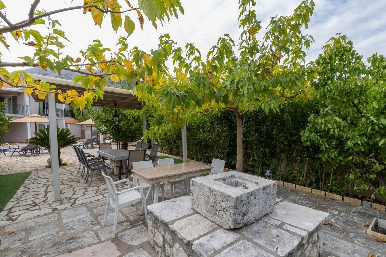 Situated 5km from Agia Efimia, offering all amenities and a short drive from the famous Myrtos beach. Within walking distance to Makriotika village where you can have coffee or eat at a few local tavernas. On foot you can also find a mini market, a butcher shop and a little further a bakery. The area is ideal for hikers as there are numerous walking trails – you can also walk to the monastery of Themata.