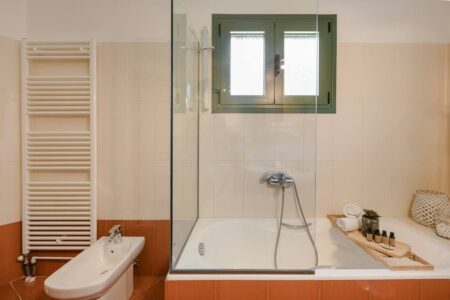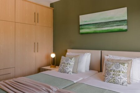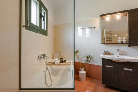 This luxurious 2 storey villa has three bedrooms. Bedroom’s one and two are located on the first floor. Both rooms have two single beds that can convert into a queen size double bed. The first floor bathroom has a basin, WC and a tub. Bedroom three is located on the ground floor and has a queen size double bed and an en-suite bathroom with shower, WC and basin. There is an extra WC on the ground floor.
